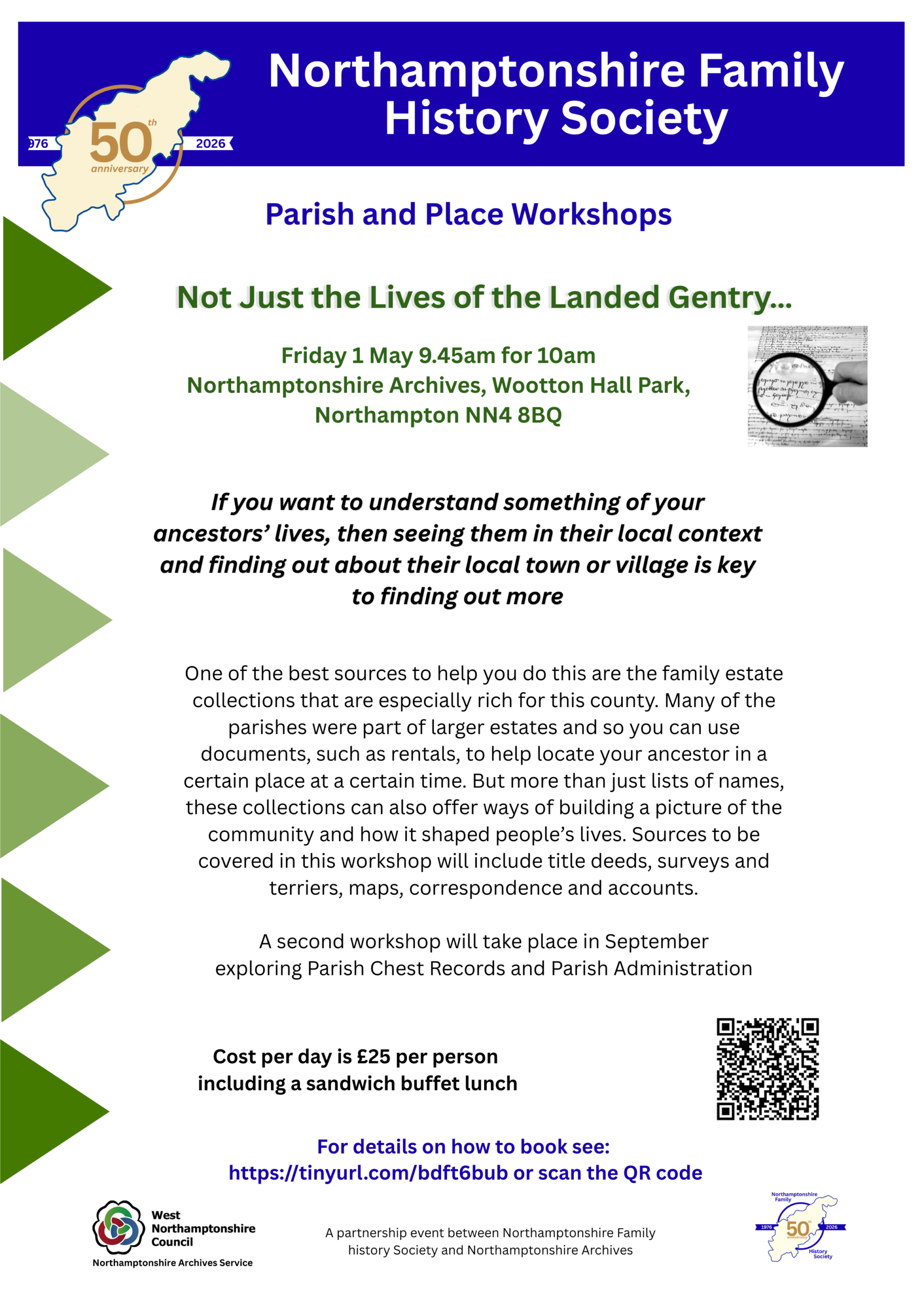 | Friday, May 1 09:45 for 10:00am | Northamptonshire Family History Society & Northamptonshire Archives Service Place and Power Workshops Not Just the Lives of the Landed Gentry... | Yes | Click here for more information then zoom to enlarge, or click here for a PDF. |